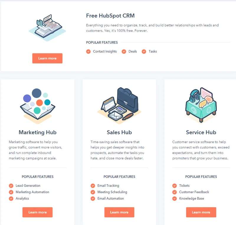Conçues pour aider les entreprises à grandir et se développer plus rapidement, les solutions Hubspot se distinguent en plusieurs catégories :